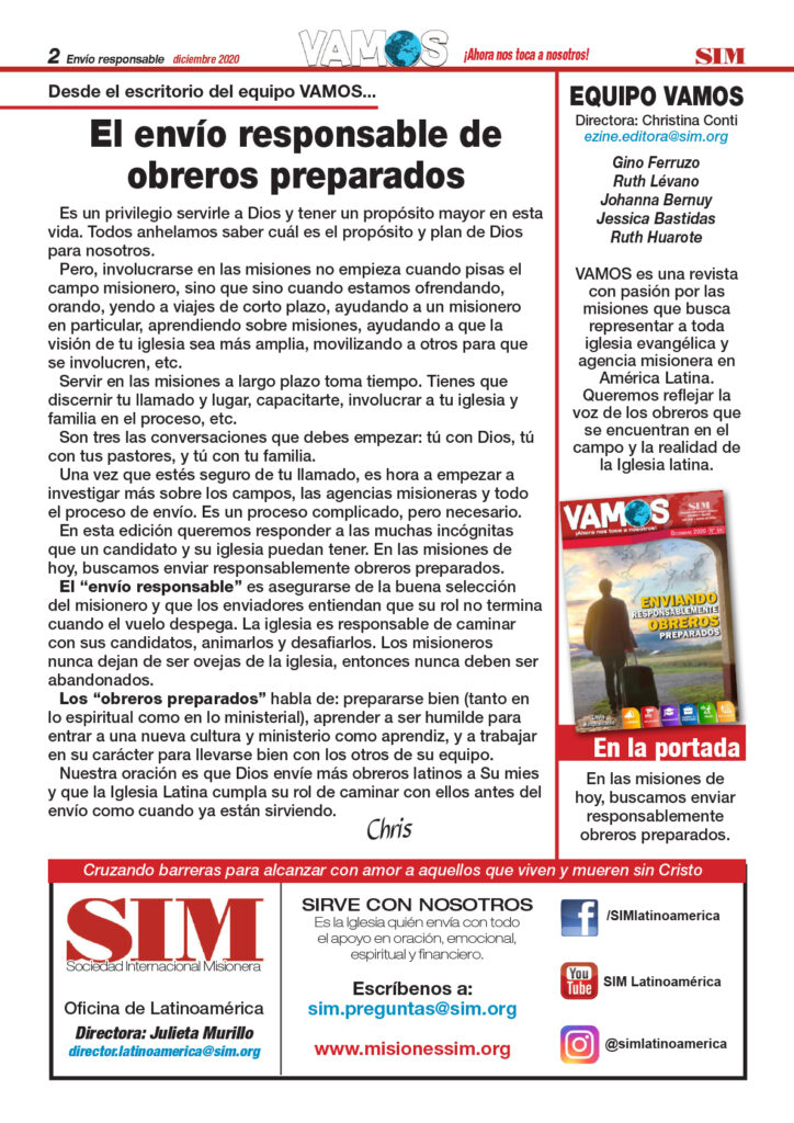 El “envío responsable” es asegurarse de la buena selección del misionero y que los enviadores entiendan que su rol no termina cuando el vuelo despega. La iglesia es responsable de caminar con sus candidatos, animarlos y desafiarlos.